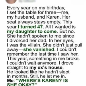 My forty-seventh birthday passed in near silence, with only three plates set on the table and one chair deliberately left empty — a quiet reminder of the daughter I hadn’t…