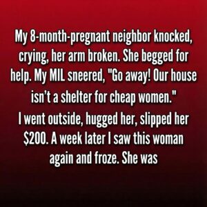 It was late evening when frantic knocking shattered the quiet in our home. When I opened the door, our neighbor stood there trembling, visibly distressed and heavily pregnant, one arm…