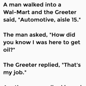 A man walked into a Wal-Mart and the greeter said, “Automotive, aisle 15.” Surprised, the man asked how he knew he was there for oil. “That’s my job,” the greeter…